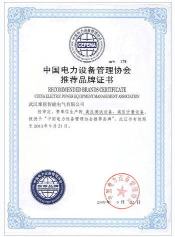 中国电力设备管理协会推荐品牌证书