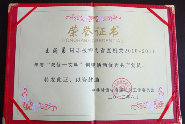 2012年6月王海勇同志被中共甘肃省直属机关工委评为“优秀共产党员